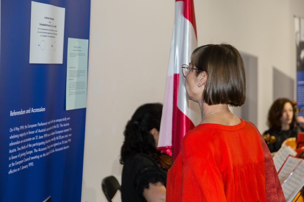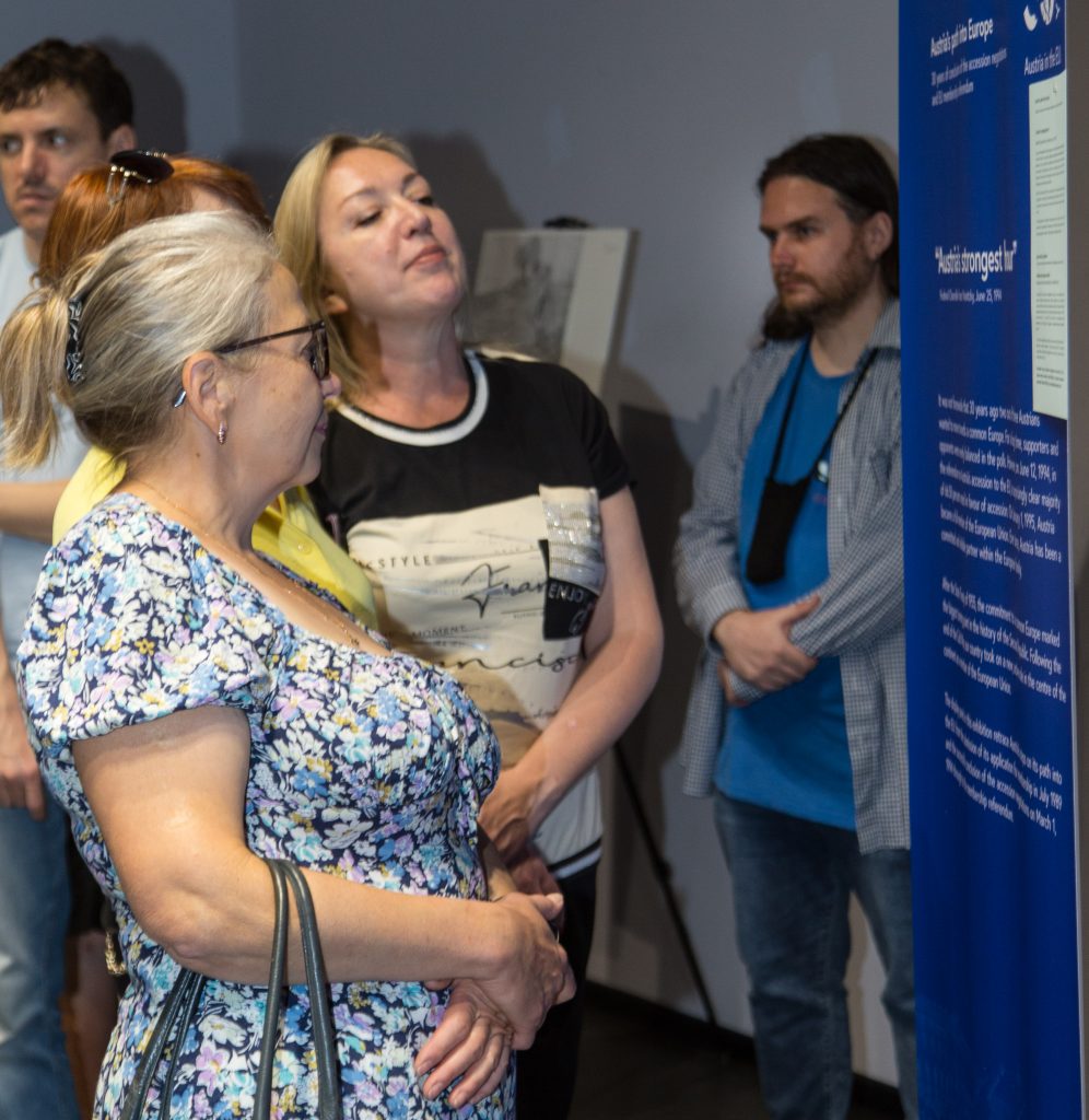Експозиція складається з 12 банерів, які ілюструють ключові події на шляху Австрії до об’єднаної Європи – від подання заявки до проведення національного референдуму та підписання Договору про вступ.
